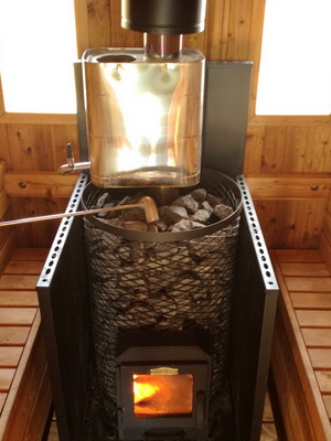 Дополнительную подачу пара можно производить, не прекращая топки печи, которая в это время осуществляет нагрев бака. Кроме того, сухой горячий воздух можно получить, нагревая камни без полива.