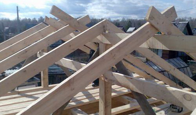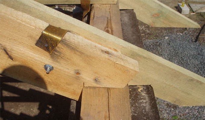 При самостоятельном монтаже кровли и стропил рекомендуется использовать стропила и балки перекрытия одинакового сечения 50х150 мм. Во время монтажа стропильной фермы необходимо соединение стропил в нескольких местах. Делать это удобнее с помощью накладок из обрезков стропил и «сотого» гвоздя или шурупа, что позволит сэкономить на закупке дополнительных материалов. При соединении стропил также применяются перфорированные пластины.