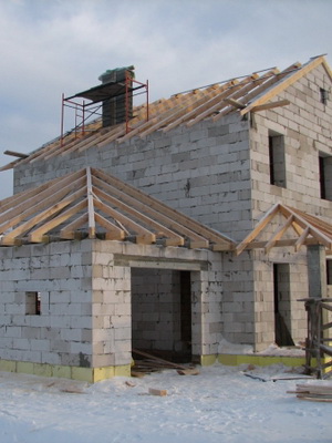Когда пролеты будут выполнены, необходимо произвести закрепление внешней стены. На фундамент между опорами внешней стены укладывается брус по размеру сечением 10×10 см, после чего последний крепится к стойкам с помощью саморезов. Затем производится выравнивание стоек по отвесу в вертикальном направлении, далее выполняется крепление с применением упоров, стяжек.