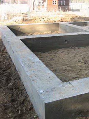 После того как место для постройки будет определено, подготавливают к строительству рабочую площадку. Почва при заливке столбчатого фундамента для гаража удаляется на глубину 10-16 см, проводится разметка с учетом прямоугольности углов, устанавливаются по углам колышки, натягивается разбивочный шнур. Затем по разметке роется котлован. Для сухого песчаного грунта глубина траншеи составляет 60 см, для глинистого — 80 см. Для выполнения цоколя по верху траншеи для фундамента внутри и снаружи укладываются брусья или доски с соблюдением размеров гаража. После этого в котлован закладывается бетонный раствор, который тщательно затем утрамбовывается. Крепежные элементы необходимо установить до того, как бетон затвердеет. В бетонный раствор можно добавить при необходимости щебень и битый кирпич.