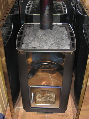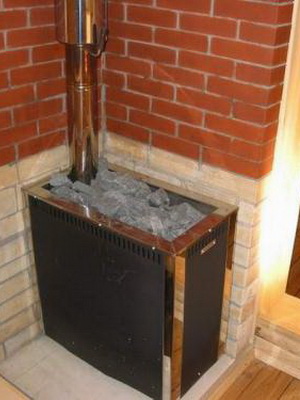 В электрокаменках постоянного действия, которые произведены на заводе, нагрев камней происходит благодаря трубчатым электронагревателям, входящим снизу в толщу каменной засыпки. Перед тем как выбрать электрокаменку для сауны, имейте ввиду, что наиболее подходящими для быстрого нагрева считаются электрические печи, в которых вентиляционный воздух не проходит через толщу камней, а свободно обходит каменную засыпку между двумя кожухами и нагревается с помощью дополнительных приборов. При этом нагрев камней происходит до 350-450 °С, а воздуха — до 100-120 °С. Увеличив количество камней в засыпке, можно добиться повышения запаса накапливаемого ими тепла для образования пара.