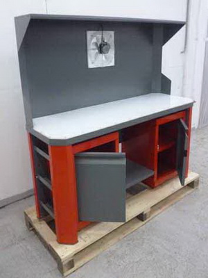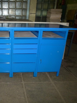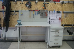 Тумбочка под инструменты оснащена двумя ящиками: один навесной на дверце, другой выдвижной — количество ящиков и их функциональность могут быть любыми в зависимости от потребностей. Сверху тумбочка оборудована откидной крышкой в виде ящика. Крышка присоединяется к каркасу петлями. В рабочем положении ее можно откидывать и опирать о стену или же можно оснастить ее удерживателями, чтобы она самостоятельно оставалась в заданном положении. В нерабочем состоянии крышка будет просто опускаться, и закрывать тумбочку.