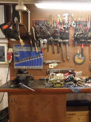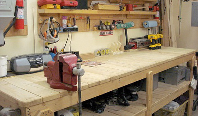 Гараж является обычно не только местом, где хранят автомобиль, но и маленькой домашней мастерской. А в любой мастерской рабочий стол или верстак — это предмет первой необходимости. Можно сделать упрощенный верстак в гараж небольших размеров. Длина и ширина его определяются размерами отведенного для него места в помещении. Для небольшого гаража размер верстака длиной 1,5 м и шириной 0,6 м будет оптимальным. Высота самодельного слесарного верстака для гаража определяется ростом работающего за ним человека и подбирается индивидуально. Считается, что высота рабочего стола должна быть такой, чтобы его верхняя крышка была на уровне середины ладоней опущенных рук прямо стоящего человека. Верстак с меньшими размерами верхней крышки может быть не совсем удобным.