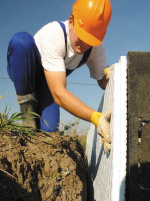 Утепление фундамента слоем теплоизоляционного плитного материала (пенопласта или пенополистирола) на фото.