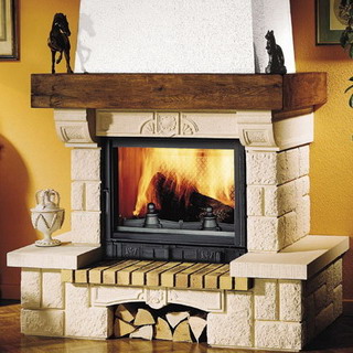 Усилитель тепла марки Е. В35. Состоит из двух основных элементов: емкости для углей и топочной части. Усилитель устанавливается как в выкладываемый, так и в уже существующий камин и встраивается в основание топки. Тепло аккумулируется за счет инверсии огня в чугунном (нижнем) отделении. Дрова прогорают в верхней части топки, после чего через специальные раздвижные пластины ссыпаются в нижний резервуар. Тепло распространяется через решетки вентиляции камина на протяжении 8-10 ч. В комплект усилителя тепла Е. В35 также входит чугунная пластина, которая монтируется на задней стенке топки.
