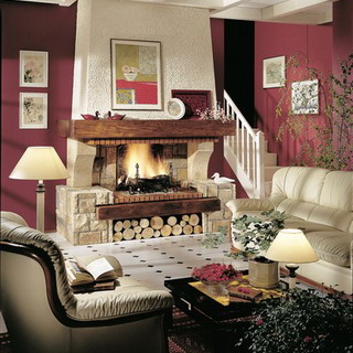 Камины в стиле кантри (в деревенском стиле, или рустичные) напоминают по форме букву «Д». Как видно на фото, над топкой камина в этом стиле обязательно монтируется массивная деревянная балка, на которую принято ставить подсвечники, часы, миниатюрные скульптуры. Наверху конструкции располагается колпак (кожух) из гипсокартона, скрывающий дымоход. Нередко для облицовки таких каминов мастера используют ракушечник или песчаник. Этот отделочный материал гораздо проще обрабатывать.