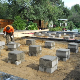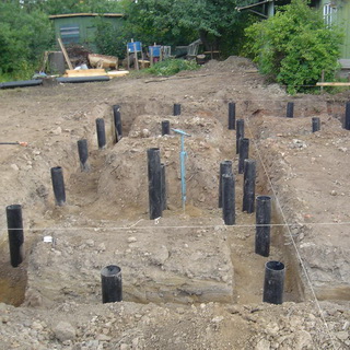 Столбчатые фундаменты являются наиболее экономичным типом основания. Опыт их применения показывает; что по расходу материалов и оплате труда они почти вдвое дешевле ленточных, а с увеличением глубины заложения эта цифра возрастает еще больше. Использование фундаментов такого типа позволяет возводить дома даже на пучинистых грунтах при большой глубине промерзания, а также в тех случаях, когда пригодный для надежного основания грунт залегает на глубине свыше 3 м. Правда, подходят столбчатые фундаменты лишь для постройки легких зданий (деревянных или каркасно-щитовых домов) без цокольных и подвальных помещений.