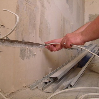 Выполнив разметку скрытой электропроводки, по готовой штукатурке прорезают контуры штробов, которые должны иметь глубину 4—5 см, после чего выдалбливают их на глубину, достаточную для размещения ПВХ-шланга.