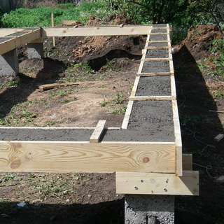 В индивидуальном строительстве ростверк чаще всего армируют и отливают из бетона, для чего используют обычную дощатую опалубку. Полученная «лента» располагается над землей с небольшим зазором (обычно 100—150 мм) для компенсации возможного пучения грунта. Кроме того, такой зазор обеспечивает минимальный контакт фундамента с мерзлым грунтом, что способствует снижению тепловых потерь. После полного монтажа фундамента зазор желательно закрыть декоративными панелями, асбестоцементными листами или антисептированными досками.
