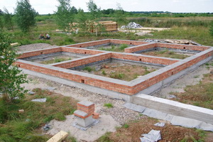 По технологии ленточного фундамента все внутренние стены и перегородки, опирающиеся на основании, а также пристройки (терраса, эркер, крыльцо) привязываются к основному контуру дома и аккуратно переносятся с чертежей. После разбивки фундамента всего дома можно приступать к земляным работам. В первую очередь снимите верхний растительный слой грунта (150—250 мм) под всей площадью дома. Это обезопасит вас от образования плесени в подполе, загнивания деревянных конструкций и просадки грунта. Эту процедуру можно осуществлять как вручную, так и с привлечением специальной техники (экскаватора) в зависимости от ваших финансовых возможностей.