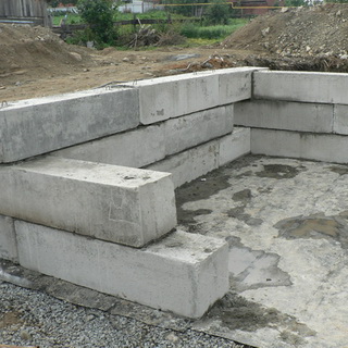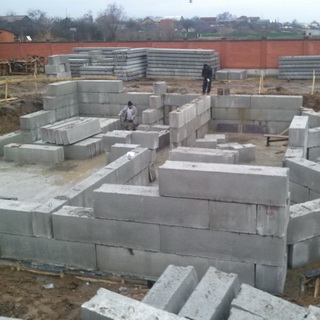 Монтаж бетонных блоков ведется вразбежку, подобно кирпичной кладке, на цементный раствор, в четыре-пять рядов в высоту. При этом следует выполнять все необходимые и возможные перевязки внутренних и внешних стен. Не забудьте оставить между блоками расстояние для прокладки труб водоснабжения и канализации, тепло- и электроснабжения и т. п. Как утверждают специалисты, монтаж сборного фундамента все же лучше доверить бригаде профессионалов, состоящей как минимум из четырех человек: машиниста крана, такелажника и двух монтажников.