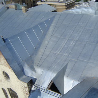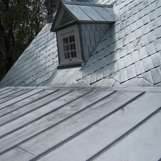 Еще одним вариантом кровли из цветных металлов является использование листов или полос, изготовленных из сплава цинка и ряда легирующих добавок — титана, меди и алюминия. Чистый цинк обладает уникальными антикоррозионными свойствами, но имеет низкую пластичность. Ее придают медь и алюминий, а титан добавляет материалу дополнительную прочность. На кровле из листового металла с течением времени также образуется защитная, эффектно смотрящаяся патина. Сам по себе сплав абсолютно безопасен для здоровья человека, так как не содержит канцерогенных веществ.