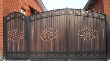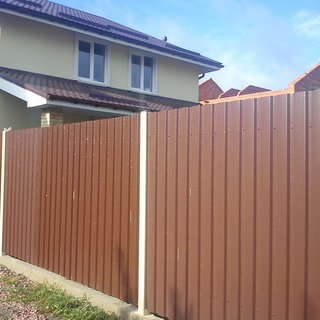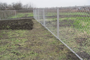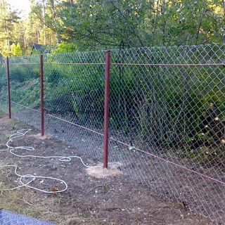 В отличие от деревянного, у забора из металла, возведенного своими руками, существует много достоинств, главными из которых являются его долговечность и устойчивость к механическим воздействиям. В качестве столбов для таких заборов чаще всего используют трубу диаметром 60—100 мм. Верхние торцы столбов следует закрыть крышками, препятствующими проникновению влаги в полость трубы. Наиболее часто в качестве ограждений в металлических заборах используют проволочную сетку рабицу, профнастил или сварные секции из различного металлического профиля. Самым популярным является забор из сетки рабицы, выполненный своими руками, — это связано с доступностью данного материала и простотой сборки данной легкой, но прочной и долговечной конструкции.