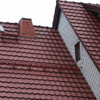 Планки примыкания используются в местах сложных переходов скатов, около дымоходов и для закрытия тех мест, где сходятся стена и кровля. Внутреннюю планку прикладывают к стене или трубе дымохода и отмечают ее верхнюю кромку. Затем по намеченной линии пробивают штробу. Вдоль стены (вокруг дымохода) монтируют и закрепляют к обрешетке шурупами-саморезами планку перехода, не забывая делать нахлесты около 150 мм. Второй край планки вставляют в штробу и герметизируют. Поверх планки примыкания монтируются листы металлочерепицы. Сверху соединение закрывают наружной планкой примыкания. Она устанавливается так же, как и внутренняя, но ее верхнюю кромку крепят прямо к стене, не заводя в штробу.