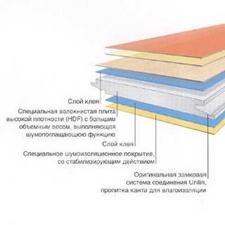 Ламинат — многослойный материал, в котором каждый из слоев выполняет особую функцию. Его основой является панель из ДВП, ДСП или ДМФ, покрытая слоем звуко- и гидроизоляции. Длина панели — от 1200 до 20 000 мм, ширина —190—200 мм. Сверху на основу уложен крафт-картон повышенной прочности, пропитанный синтетическими смолами. Картон покрыт декоративным слоем на бумажной основе, на который нанесен рисунок. Благодаря именно ему ламинат имеет столь разнообразный внешний облик, имитируя различные сорта древесины, природного камня или демонстрируя дизайнерские находки.