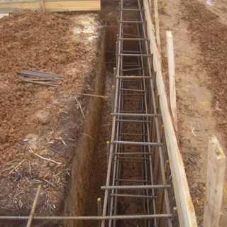 7. Установите каркас, изготовленный из металлических профилированных стержней (арматуры), сваренных или перевязанных проволокой (для этого применяется специальная вязальная проволока из мягкого черного металла диаметром около 1 мм). Ширина ячейки каркаса зависит от ширины фундамента. Так, например, для фундамента шириной 400—500 мм она может быть равна 300 мм. Высота каркаса равна глубине фундамента минус 100—200 мм. Расстояние между ячейками — примерно 400 мм. Арматура может иметь сечение 12—1бмм. Все конструкции из нее должны находиться внутри фундамента не ближе 50 мм от дна и стенок траншеи (опалубки).