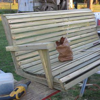 Выпилите из фанеры или ламинированной ДСП по две детали боковины и крайней планки (одна из них будет выполнять роль верха спинки, вторая — переда сиденья). Размеры для данной модели деревянных качелей, изготавливаемых своими руками, указаны ориентировочно, их легко можно изменить в соответствии с вашими потребностями. Отрежьте от бруса сечением 80 х 20 мм семь деталей спинки и сиденья длиной по 600 мм. Вместо бруса можно использовать полоски шириной 80 мм, вырезанные из фанеры или ламинированной ДСП. В том случае, если вы избрали в качестве материала доску или фанеру, отшлифуйте торцы, а если ламинированную ДСП — оклейте их декоративной лентой.