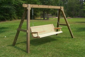 Посмотрите выше на фото каркаса качелей из дерева своими руками – конструкция достаточно прочна, чтобы выдержать взрослого человека.