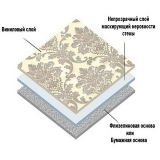 Виниловые обои производят по многослойной технологии. Они состоят из двух слоев: нижний из бумаги (или ткани) покрывается слоем поливинила, а затем на поверхность наносится рисунок или тиснение. Это позволяет использовать такой материал для отделки помещений, в которых необходимо производить частую влажную уборку с применением моющих средств. Главным недостатком виниловых обоев, как, впрочем, и любого другого синтетического материала, является воздухонепроницаемость.