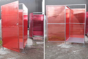 После того как вы найдете подходяще место и установите конструкцию, самое время подумать над тем, чем лучше всего будет обшить летний душ. Для внешней отделки можно использовать листы шифера, профнастил, пластиковые панели или влагостойкую фанеру. Если внутри кабинки запланирована раздевалка, позаботьтесь о том, чтобы помещение было разделено на две отдельные части. Чтобы в раздевалку не затекала вода, можно будет сделать небольшой порожек.