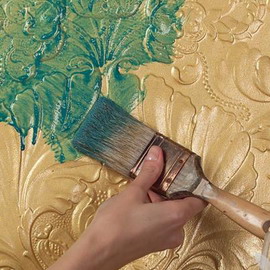 Обычное окрашивание не требует специальных навыков и приспособлений. Перед тем как покрасить линкруст нужно будет подготовить мягкий велюровый валик. Краску следует наносить тонким слоем сверху вниз, тщательно заполняя все неровности объемного рисунка.