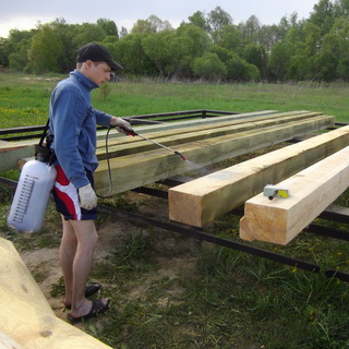 Когда все необходимые пропилы сделаны, каждый брус обрабатывают антисептиком: брусья нижнего венца — с 4 сторон, а остальные — с 3 сторон. Самый надежный способ такой обработки — с применением машинного масла.