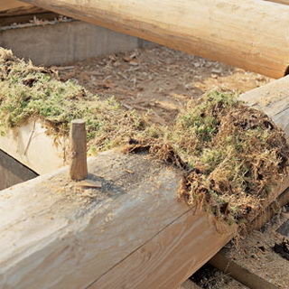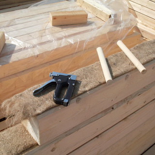 Далее прокладывают теплоизолирующий слой. Самый дешевый материал — мох, более дорогой — скрученная пакля, а самый надежный — джутовая лента.
