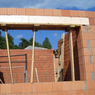 После этого приступают к кладке над оконными и дверными проемами. В боковых поверхностях закладывают пробки из деревянных брусков; их размер должен быть идентичен габаритами кирпича. С каждой стороны располагают по 2 пробки, дополнительно просмолив или обернув рубероидом.