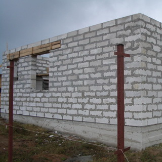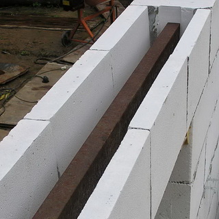 В верхней части оконных и дверных проемов размещают бетонные плиты длиной на 60 см больше ширины проема. В последнем ряду обязательно предусматривают карманы для балок потолочного перекрытия.