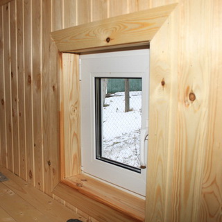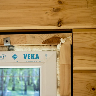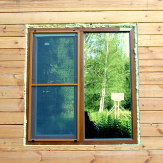 Монтаж окон в деревянной бане имеет свои особенности, поскольку и сруб, и брус дают усадку. В первый год строение высотой 3 м, оседает приблизительно на 3—5 см. Еще в течение 5—6 лет продолжает оседать, да и весь период эксплуатации постоянно деформируется, то разбухая, то ссыхаясь. Поэтому, если оконная коробка установлена впритык к проему, с течением времени венцы из дерева станут давить на нее, что вызовет разрушение стекла и рамы. Чтобы избежать подобного, коробку крепят на обсаде (окосячке) — это дополнительная коробка, которая берет на себя вес оседающего банного сруба.