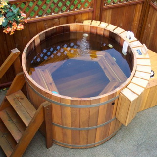 Как видно на фото, японская баня офуро представляет собой большую деревянную бочку, наполненную опилками, нагретыми до +50 °С. Человек погружается в бочку и находится в ней 8-12 минут. Опилки хорошо впитывают пот, а ценные вещества древесины (обычно используют опилки кедра) через поры проникают в организм.