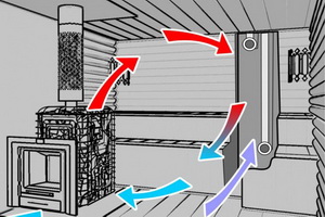 Приток воздуха обеспечивают неподалеку от печки, ближе к полу. Благодаря тому, что вентиляция находится возле печи, поступающий в помещение свежий воздух быстро нагревается и поднимается вверх уже теплым. Таким образом, люди, парящиеся в бане, получают свежий и горячий воздух, вполне комфортный для банных процедур.