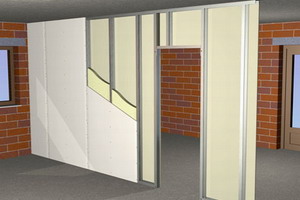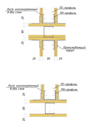 Каркасные перегородки из гипсокартонных листов. Устройство каркасных перегородок требует соблюдения технологии. Наружный слой данного типа перегородок выполняется из гипсокартонных листов (ГКЛ) с уплотненной кромкой или гипсоволокнистых листов (ГВЛ) размером 2500×1200 мм и толщиной 10 или 12,5 мм. Материал устанавливается на металлический каркас из стоечного или связующего профиля. Расстояние между частями стоечного профиля принимается равным 600 мм. Сборка каркаса выполняется самонарезающими винтами (саморезами).