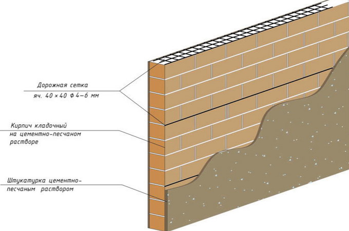 Кирпичные перегородки выполняются толщиной в кирпич, каждые 5-6 рядов укрепляются в горизонтальных швах прутками арматуры диаметром 4-6 мм. Толщина швов самой кладки составляет 10-12 мм, а толщина тех швов, в которых располагается арматура, должна превышать диаметр самой арматуры не менее чем на 4 мм. Это распространенная технология кладки кирпичных перегородок.