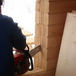 Когда образуется проем, выпиливают под брус пазы: сначала размечают место в середине проема, затем выравнивают его по отвесу или уровню.