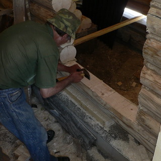 2. До того как вставить дверь в бане, проделывают в бревне паз и вставляют брусок.