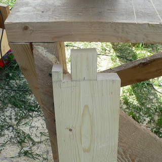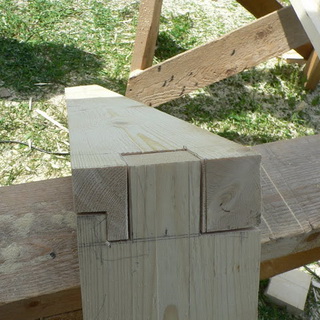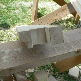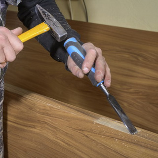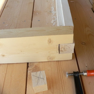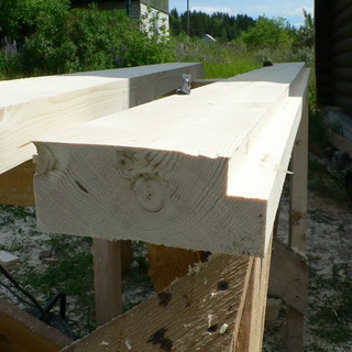 Для окосячки необходим брус 100×150 см. Лафеты отпиливают по высоте двери, выпиливают паз глубиной 5 см вдоль оси одной из сторон бруса, с обеих сторон сруба на четверть ширины стены надпиливают пазы по 5 см., получится своеобразный гребень, его окончательно формируют при помощи стамески, аккуратно отщепляя древесину.