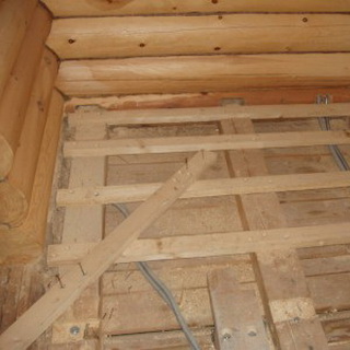 Лаги под протекающий пол выполняют на одном уровне. Работу начинают от любой стены. Но брус под лаги должен отстоять от стены на 3—4 см для вентиляции.