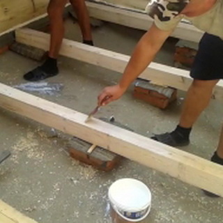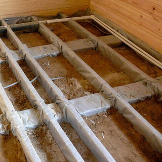 Лаги, предварительно обработанные антисептиком, помещают на опорные столбики и закладной брус, посредством гидроизоляционного материала — пергамина, рубероида, толя.