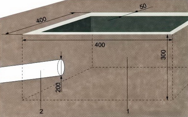 Перед тем как сделать бетонный пол в бане, надо обустроить приямок, играющий роль водосборника. Его оснащают отводной трубой диаметром 20 см, которую выводят в заранее подготовленную сточную канаву. Если, к примеру, площадь парной составляет 4 м2, то приямок должен иметь габариты: 0,4×0,4 × 0,3 м. Его стенки покрывают бетонным раствором толщиной 5 см.