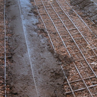 Над щебенкой на уровне около 5 см укладывают армирующую сетку, штыкованием равномерно распределяют бетон, затем снова заливают слой бетона и опять его утрамбовывают.