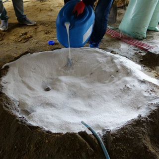 После чего в бетономешалку вводят половину десятилитрового ведра портландцемента марки М и повторно вымешивают раствор. Спустя несколько минут вливают 5 л воды и продолжают смешивание. Когда материал станет однородным, добавляют еще 2 л воды и ведро наполнителя. Непрерывное перемешивание продолжают до тех пор, пока раствор не окажется почти сыпучим.