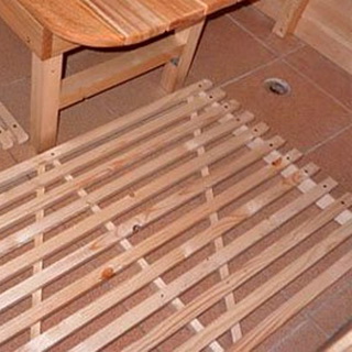 В парилке на бетонный пол неплохо уложить керамическую плитку с рельефной или шероховатой поверхностью. Когда покрытие завершено, на него укладывают съемную решетку из дерева. Это позволит легко передвигаться по нагретому полу, поскольку древесина от повышенной температуры не накаляется.