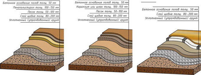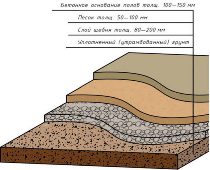 Устройство чернового пола требует предварительной подготовки поверхности. Чтобы подготовить грунтовое основание под полы, следует снять растительный грунт и просушить глинистые и суглинистые части, насыщенные водой. Если уровень грунта недостаточный, его компенсируют подсыпкой. Выполняя подсыпку, грунтовую смесь укладывают равномерно по спланированному ровному основанию и уплотняют слоями толщиной не более 10 см с помощью ручных или механических трамбовок. Не допускается использование грунта с примесью строительного мусора или с содержанием снега и льда. Поверхность спланированного основания рекомендуется подсыпать слоем песка толщиной 10-15 см.