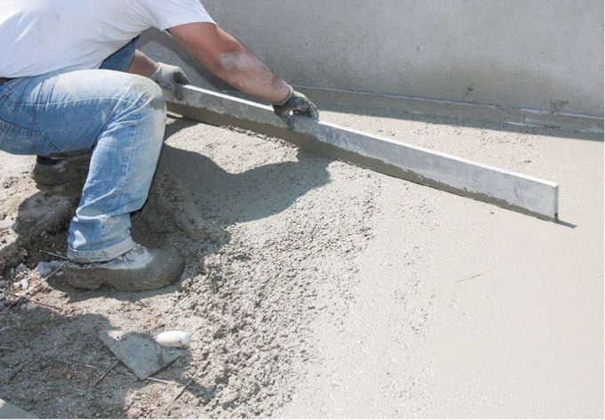 Устройство стяжки пола подразумевает формирование поверхности, которая впоследствии будет покрыта чистовым полом. Стяжки из цементно-песчаных растворов укладывают на подготовленное основание равномерным слоем толщиной 30-60 мм по маячным или ограничительным рейкам. Неровности более 5 мм выравнивают раствором марки не ниже М100. Места примыкания стяжек к стенам и перегородкам изолируют от влаги прокладками из рулонных гидроизоляционных материалов. Сразу после укладки раствора его поверхность непрерывно разравнивают до необходимого результата. Температура воздуха в помещении должна быть не менее +15 °С.
