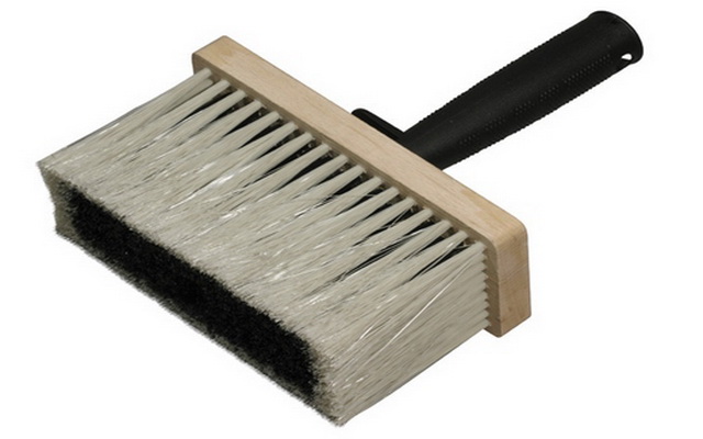 Также целесообразно применение щетки для увлажнения стен. Благодаря тому, что щетина набирает большое количество воды, смачивание стен происходит быстро. Чтобы окрасить верхнюю часть стены или потолок, щетку можно насадить на длинную палку.