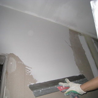 После высыхания стартового и маячного слоев шпатлевки можно приступать к финишному покрытию. Для работы используется одновременно два шпателя — большой и маленький. Маленьким набирается шпатлевка и перекладывается небольшими порциями на большой. Смесь наносится равномерно на всю поверхность.