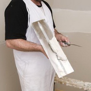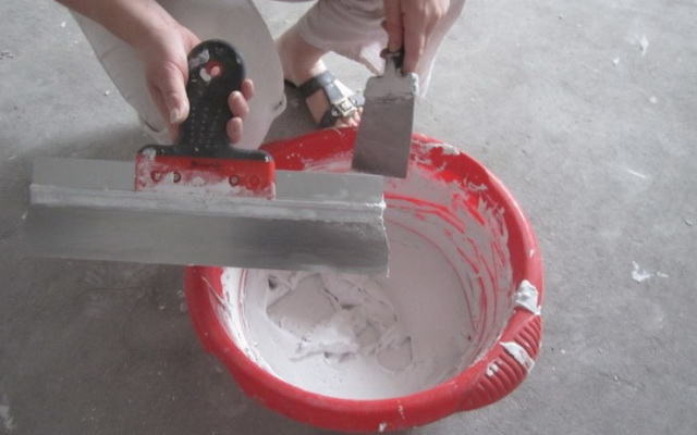 Готовый шпатлёвочный материал выкладывается в деревянный ящик или противень. Если работа предстоит на уровне груди, емкость ставится на табурет или подставку. При шпатлевании нижней части стены или пола ящик ставят на пол. Чтобы избежать высыхания смеси, ее накрывают мокрой марлей.