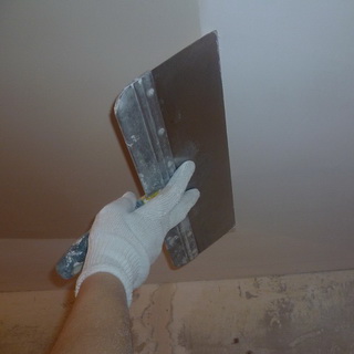 Затем одной рукой набирают подмазочный состав на узкий шпатель и перекладывают на широкий шпатель, который держат в другой руке. Упираясь левой рукой в потолок, правой нужно прижать лезвие широкого шпателя к потолку под углом 30° и, ведя по поверхности потолка вперед, нанести на него состав. Паста во время подмазки перед шпатлевание своими руками наносится сначала поперек трещины, а затем вдоль и выравнивается с помощью узкого шпателя. Стремянку или столик по мере необходимости переставляют.