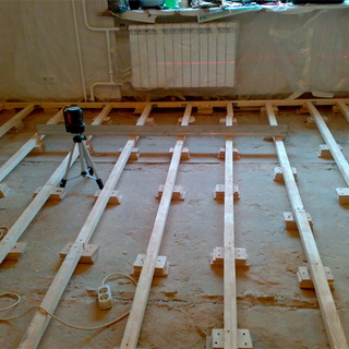 Перед тем как сделать деревянный пол с лагами, основание очищают от строительного мусора, затем засыпают и разравнивают звукоизоляцию из песка или шлака. Укладывают лаги на просмоленные прокладки с шагом 800-850 мм при толщине досок 40 мм. Если толщина досок больше, шаг можно увеличить до 1 м, если меньше 40 мм, лаги укладывают на расстоянии 500-600 мм друг от друга. Все лаги должны располагаться на одном уровне. Выравнивают лаги дополнительными слоями звукоизоляции. Подбивать деревянные клинья под лаги нельзя.